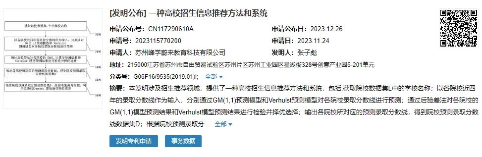 【张雪峰公司申请院校推荐专利】12月27日消息,国家知识产权局昨日公布苏州峰学蔚来教育科技有限公司申请的“一种高校招生信息推荐方法和系统”专利,发明人为该公司执行董事、控股股东张子彪(张雪峰)。 摘要显示,该发明涉及招生推荐领域,提供了一种高校招生信息推荐方法和系统,包括获取院校数据集L中的学校名称;以各院校近四年的录取分数线作为输入,分别通过GM(1,1)预测模型和Verhulst预测模型对各院校录取分数线进行预测;通过后验差法对各院校的GM(1,1)模型预测结果和Verhulst模型预测结果进行检验并择优选择;输出各院校所对应的预测录取分数线,得到院校预测录取分数线数据集D;根据院校预测录取分数线数据集D、应届考生高考分数,利用改进的Kmeans算法进行院校推荐,准确率高且推荐信息全面。(东方财富网)