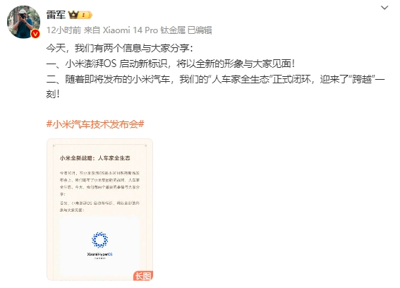 【雷军:小米澎湃OS启动新标识,“人车家全生态”正式闭环】小米创办人、董事长兼CEO雷军刚刚在微博分享了两个信息,一是小米澎湃OS启动新标识,将以全新的形象与大家见面;二是随着即将发布的小米汽车,小米的“人车家全生态”正式闭环,迎来了“跨越”一刻。(界面新闻)