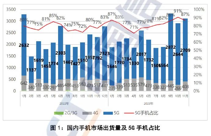 【中国信通院:11月国内市场手机出货量3121.1万部,同比增长34.3%】中国信通院数据显示,2023年11月,国内市场手机出货量3121.1万部,同比增长34.3%,其中,5G手机2709.2万部,同比增长51.2%,占同期手机出货量的86.8%。(新京报)